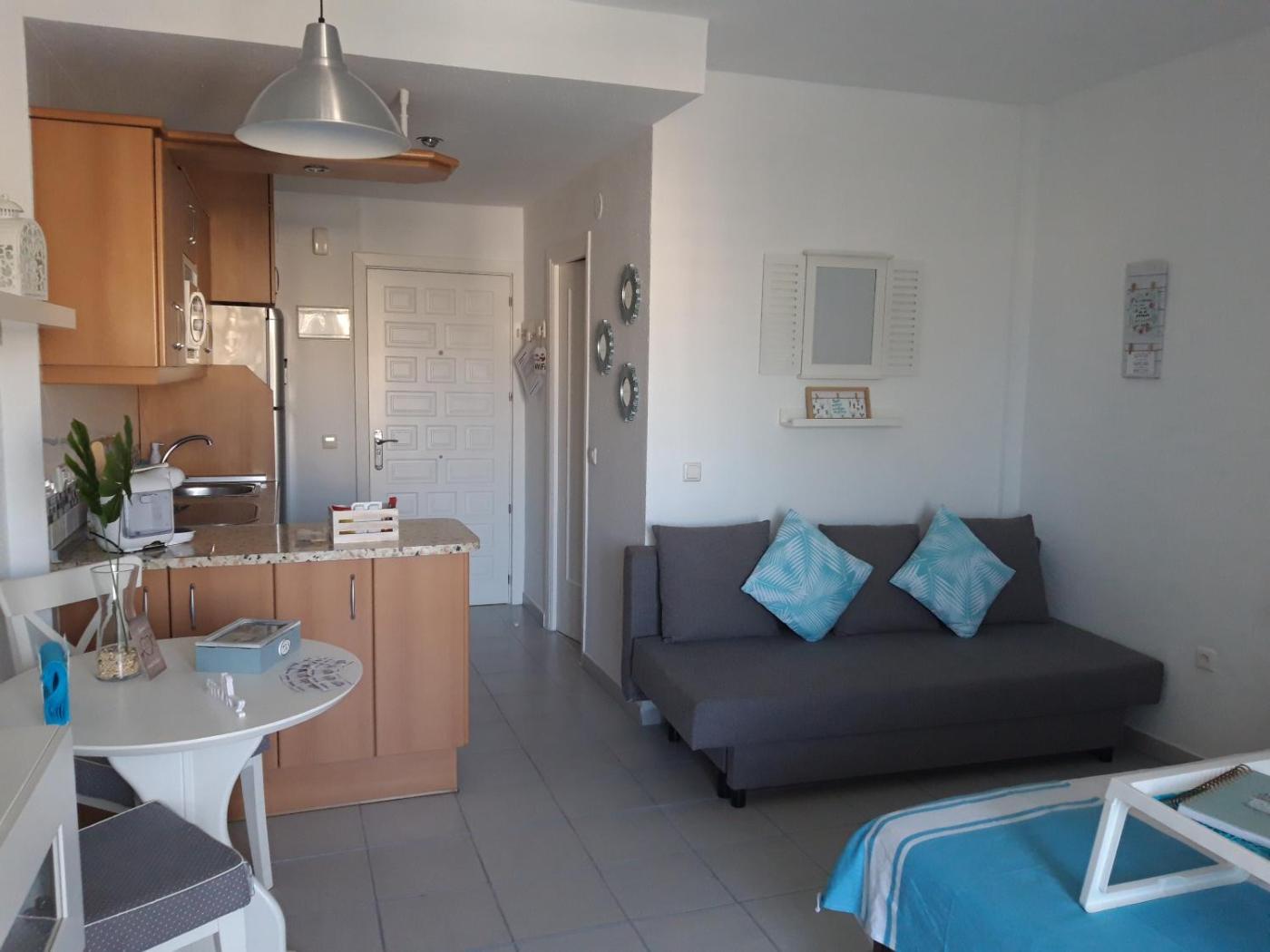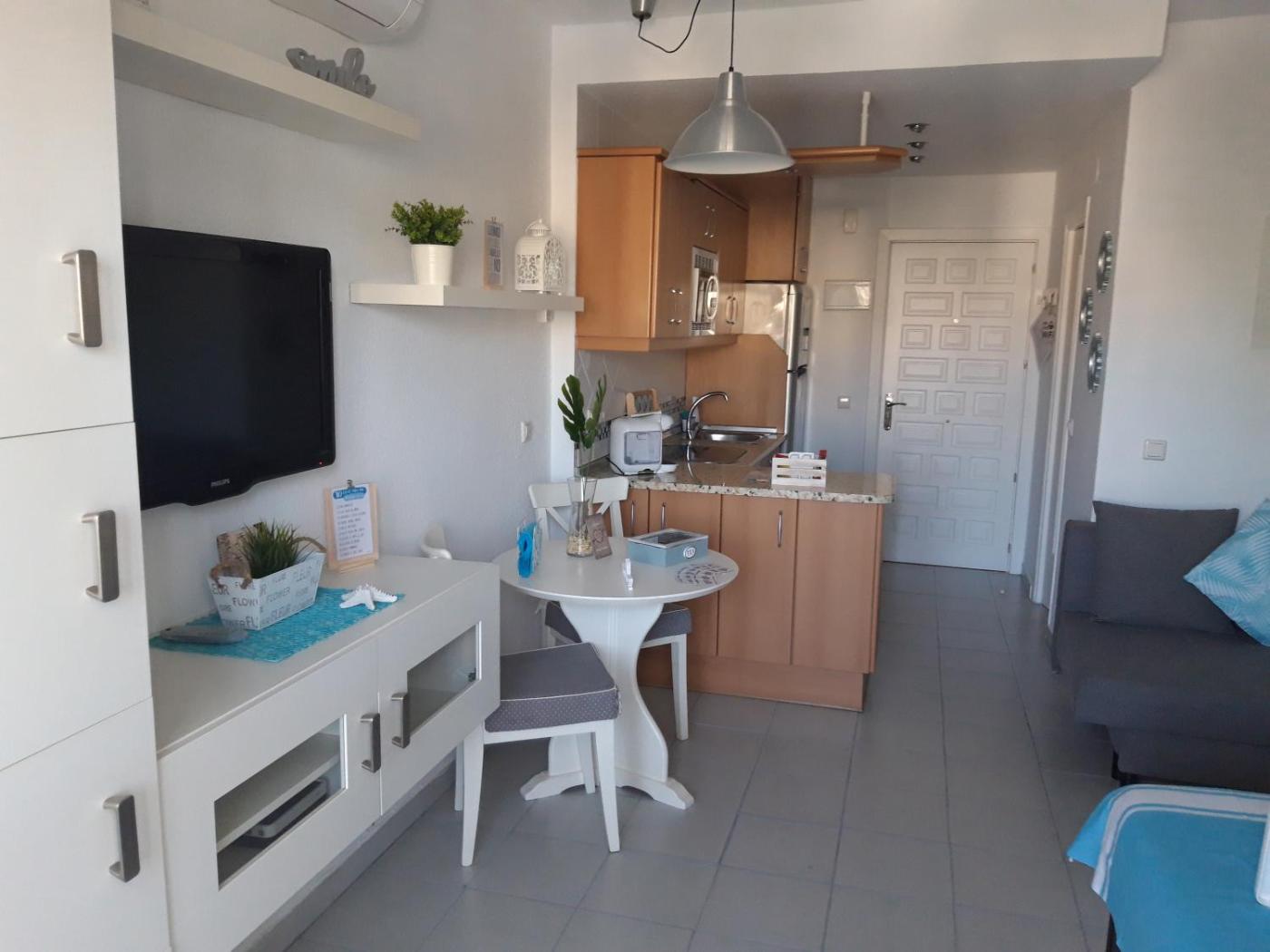 Apartamento Estudio con vistas al mar. Este apartamento tiene piscina con vistas. Apartamento con entrada privada, aire acondicionado, cocina, un dormitorio y baño con ducha a ras de suelo y secador de pelo. La cocina está equipada con nevera, utensilios, microondas y teteracafetera. El apartamento dispone de TV de pantalla plana, lavadora y terraza con vistas al mar. Incluye 2 camas. ;