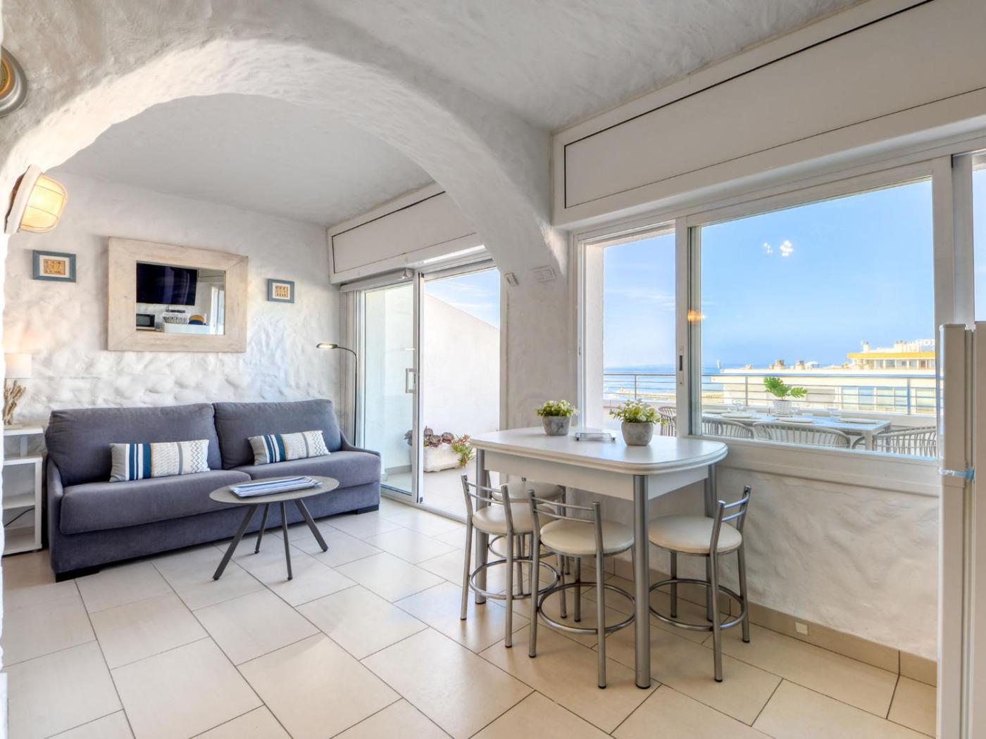 El apartamento cuenta con terraza y vistas al mar, y dispone de 1 dormitorio, una sala de estar, TV, una cocina equipada con nevera y microondas, y 1 baño con ducha.